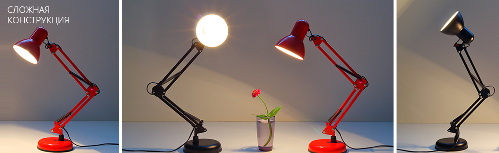 На фото примеры сложных конструкций настольных лампНастольная лампа школьника просто обязана иметь сложную конструкцию. Чтобы модель можно было регулировать, изменять под рост, местоположение, прочие нужды малыша. Гибкий штатив или штатив с шарнирными сочленениями позволяют подстроить высоту осветительного прибора, угол, направление освещения в зависимости от необходимости.